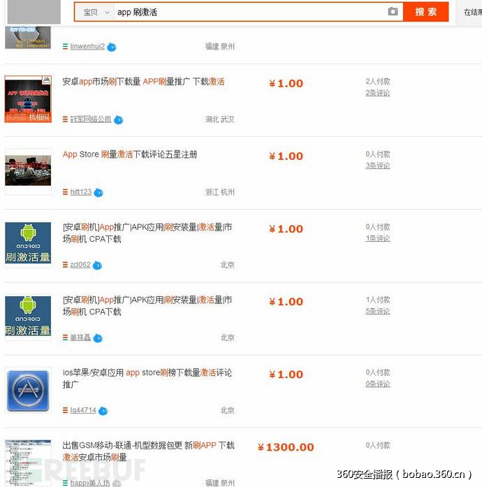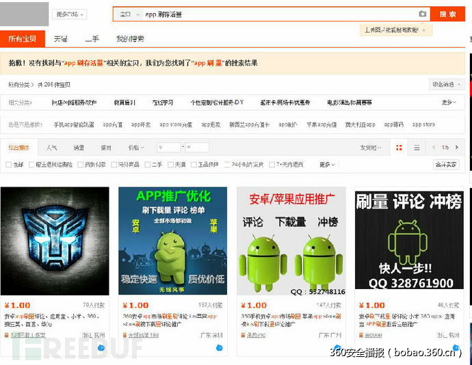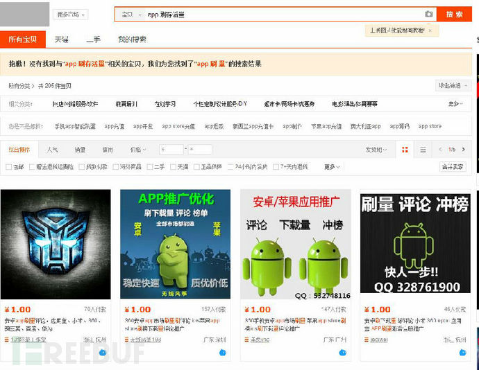 除了基本的刷流量和点击量之外,还有一些比较"高级"的刷法,如:刷下载量、刷激活量(APP被下载之后至少被打开使用一次)和刷存活量(APP下载之后还必须在一定时间内被持续使用)等。而这些业务也都能比较容易的在网上找到。下图两图是在某购物网站上分别搜索"app刷激活"和"app刷存活量"(实为"app刷量")这两个词所得到的结果。