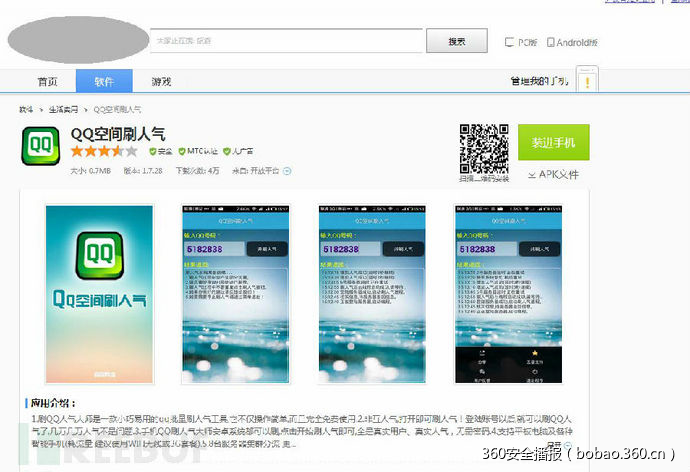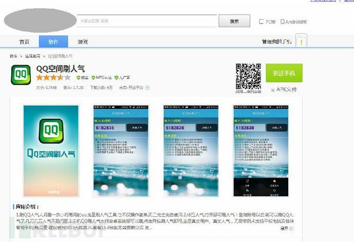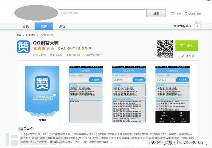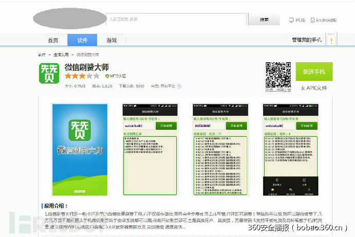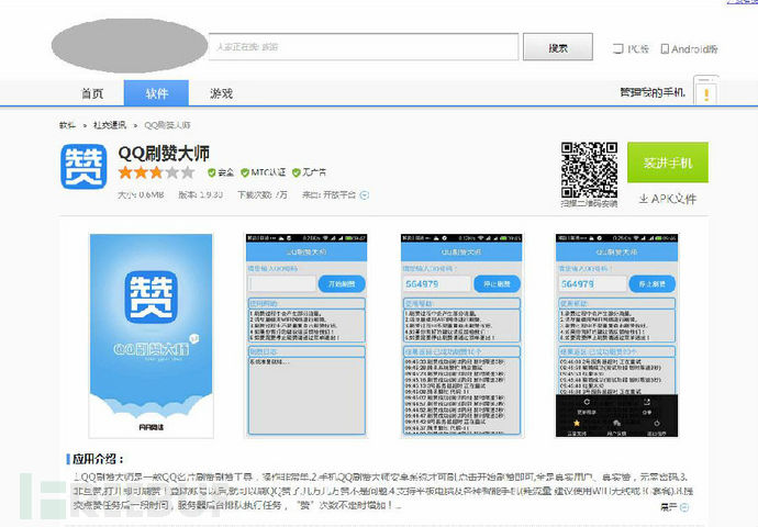 除了网站流量外,社交网络也是可以刷的。下面几张图是我们在某手机应用商店中查询到的一些专门针对腾讯微信、QQ和QQ空间的刷赞、刷人气工具。