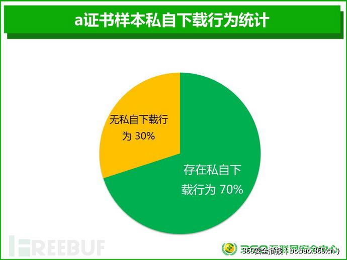 而在目前360互联网安全中心已经截获的所有使用a证书的3600余个APP样本中,约70%存在私自下载行为,而且这种情况已经至少持续了12个月以上。