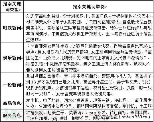 下表给出了木马从服务器上取回的各类搜索关键词中的"热词"举例。