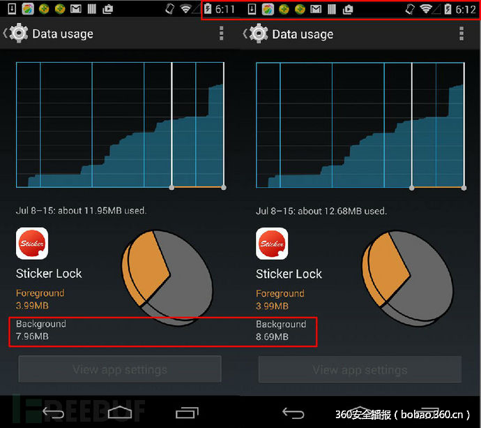 我们使用系统自带了流量检测工具Data Usage对一款被植入了"流量僵尸"木马程序样本进行测试。下图记录了一次解锁屏幕过程中,该木马样本消耗用户手机流量的情况。从图中可见,这个感染了木马的应用程序在屏幕解锁前后的前台流量没有变化,均为为3.99MB,而后台流量却从7.96M增加到了8.69M,也就是说,在这一过程中,木马使被感染的应用程序多消耗了用户手机0.73M的流量。此外,后台监测记录还显示,该木马样本在本次测试中,共调用android.webkit.WebView.loadUrl方法11次。