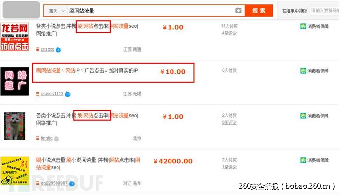 除了木马之外,网上还有很多公开或半公开的虚假流量交易。比如,下图就是在某购物网站上搜索"刷网站流量"一词所得到的查询结果页面。可以看出,想在网上购买点击量、广告点击量都不难找到。
