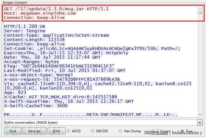 样本启动后,云控后门向服务器发起请求,联网下载名为msg.jar 的恶意插件,下载信息如下面的数据包截图所示: