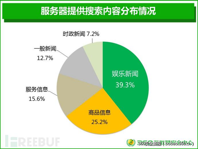 为了进一步研究流量僵尸木马的行为特征,2015年7月22日,我们对部分木马的样本进行了一次取词测试。我们将部分流量僵尸木马的样本置于沙箱中进行了20000次的测试实验,并将服务器提供给木马的搜索关键词进行了记录分析。统计结果显示,在这20000次的测试中,木马样本共从服务器取回搜索关键词474个(去重),单个关键词最多被重复取回了358次。这些搜索关键词大致可以分为5种类型:时政新闻、娱乐新闻、一般新闻、商品信息和服务信息。从不同类型的关键词被取回的总次数来看,娱乐新闻最多,占39.3%;其次是商品信息,25.2%;服务信息、一般新闻和时政新闻分别占比15.6%、12.7%、7.2%。
