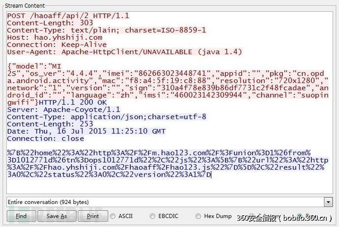 样本首先访问初始网址http://hao.yhshiji.com/haoaff/api/2 获取home页地址及跳转页JS文件信息,获取信息的数据包如下图所示: