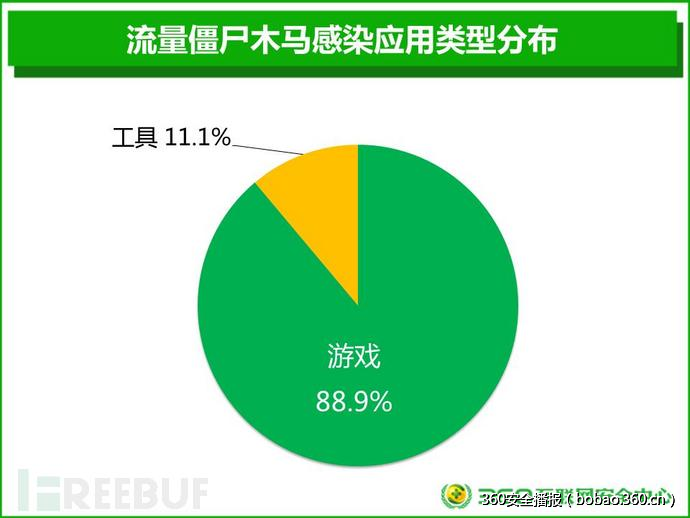 在目前已经截获的90款感染流量僵尸木马的应用中,80款为游戏类应用,占88.9%,10款为工具类应用,占11.1%。