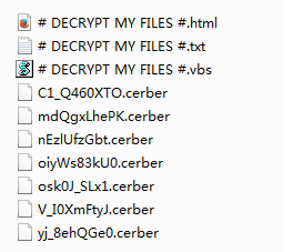 此外,被Cerber勒索软件感染之后,每个目录下还会生成额外的3个文件:# DECRYPT MYFILES #.txt 、# DECRYPT MY FILES #.html、# DECRYPT MY FILES #.vbs, 这三个文件的作用就是提示用户已经感染了 Cerber勒索软件,并索要赎金。