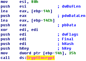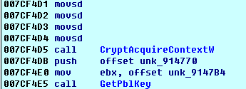 Locky勒索软件选用RSA算法和AES算法作为其加密算法。但不同的样本对 AES和RSA的实现略有不同,本小节分析的样本中,其RSA算法使用微软提供的 CryptAPI 实现: