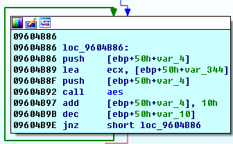 其中,RSA算法用于加密随机生成的AES密钥,RSA 算法的公钥在Locky勒索软件运行时从攻击者C&C;服务器中获取。AES 算法用于加密受害者的用户文件,其主要由 aesenc指令实现,该指令具有较高的执行效率: